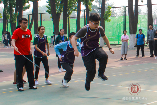 一根长长的跳绳,十个斗志昂扬的面庞,十双紧紧锁定上下翻涌的跳绳的眼睛,随着跳绳而一个接一个的跳跃,队员们气喘也不停歇。最终,在经管的队员们不懈努力之下,取得了第三名的好成绩。