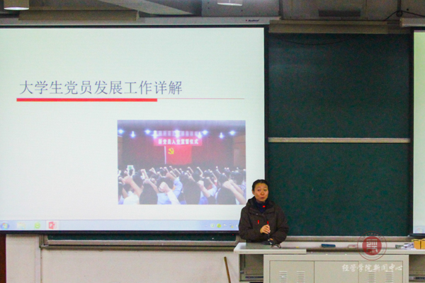 第二讲的主题是“大学生党员发展工作详解”,主讲人为校党委组织部部长赵和文老师。