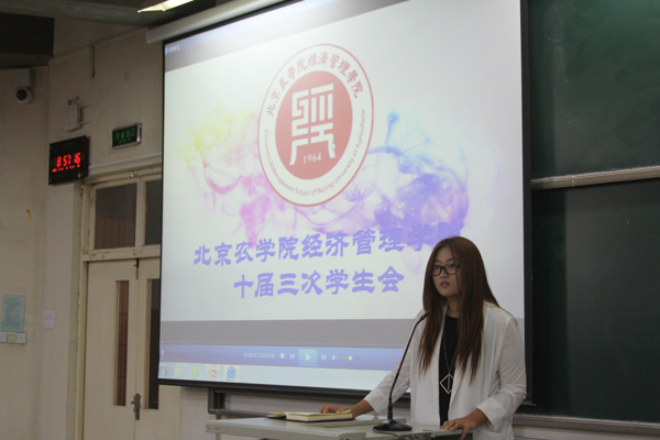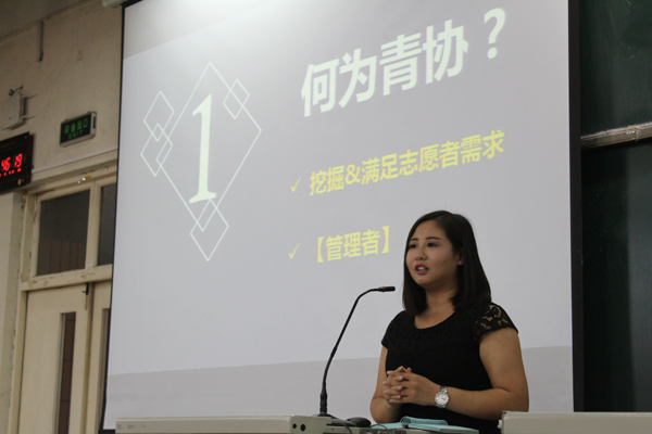 会议伊始,团委成员对同学们详细说明了团委协同合作的一些工作要求,随后由学生会主席颜佳雯就学生会各部门分工与组织作用以影片的形式做出了大致介绍。