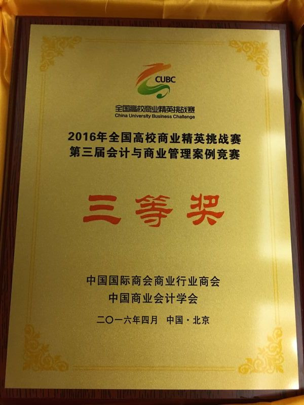 2016年4月9日,由中国国际商会商业行业商会、中国商业会计学会联合主办的全国高校商业精英挑战赛第三届会计与商业管理案例竞赛暨2016年两岸三地大学生会计与商业管理案例竞赛在北京举行。我院2013级会计学专业的孔磊、孙钰涵、吴连重、安紫静、李晨等五位同学代表学校参赛,并荣获三等奖。