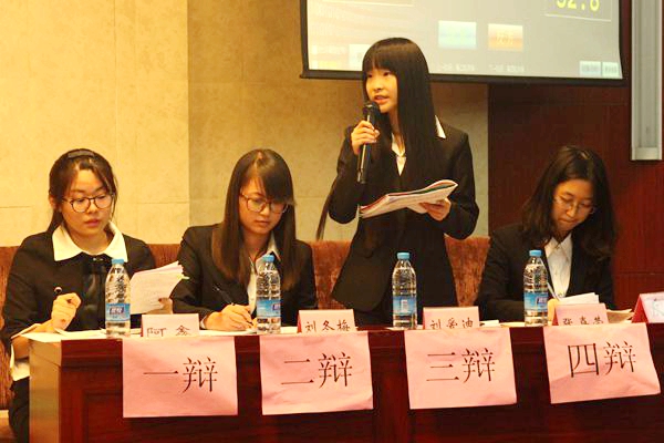 继正反双方自我介绍后,比赛正式开始。正方从立法、执法、修改法等方面阐述“法也容情”,而反方则从规律的客观实在性入手论述“法不容情”的观点。辩手们幽默灵活、机智多变。