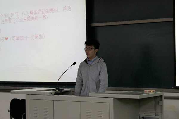接下来,外联部部长李嘉鑫向干事们传授了活动策划的写作技巧和经验,以曾举办过的活动为例,详细讲解了拟写策划的流程与环节,并就其中需要注意的重点进行了强调,要求干事们注意工作细节,做好后勤保障和应急预案。