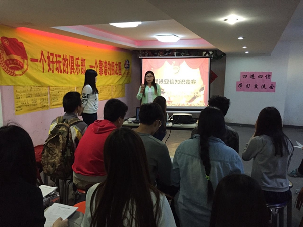 会议初始,主持人首先由“两会”引出话题,接着围绕“社会主义核心价值观”和“中国梦”展开了讲解,使同学们对于讲话精神有了初步的了解。之后便开始了交流主题——“四进四信”,主持人带领大家认真深入学习了“四进四信”精神的提出背景和主要内容,并重点讲解了“四进”,即通过“进支部,进社团,进网络,进团课”,将理论与大学生的学习生活紧密相连,进一步增强了同学们对讲话精神必要性、战略性的认识。在讲解的过程中,主持人不时的提出相关的问题,志愿者们积极回答,并由青年汇工作人员为答题者提供了小礼品作为纪念,随后大家围绕话题展开了热烈的讨论,现场气氛活跃。