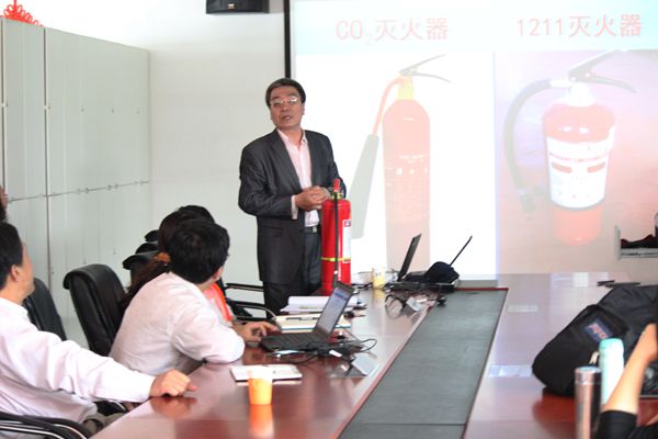 最后,他讲述了灭火器的种类以及其正确的使用方式。于老师以幽默的语言及生动的演示使得老师们牢牢的记住了灭火器的使用要点。