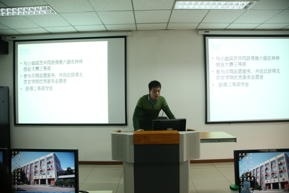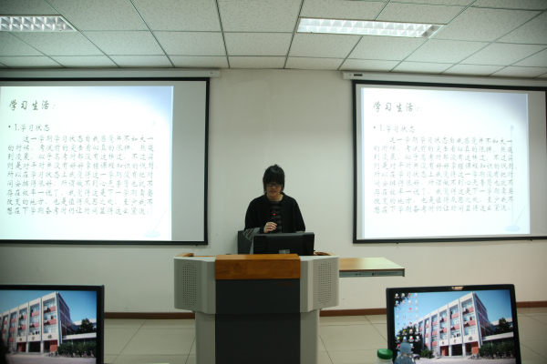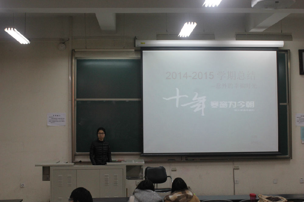 接下来同学们采用PPT的形式上台进行学期总结汇报。在学习方面同学们分析了各自在课堂出勤、考前准备等方面的进步与不足,制定下学期的学习计划;在社团活动方面,分析了各自在学生会、团委、社团等各方面的成就与收获;在生活方面,通过照片展示出同学们之间的友情。
