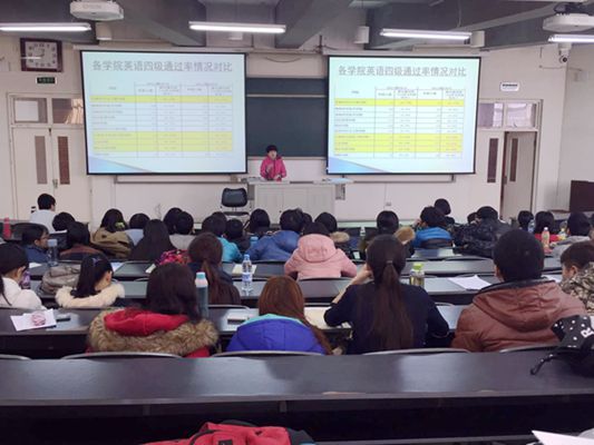各专业成绩统计、各班一次性通过四级比率、一次性通过四级宿舍情况等数据的统计分析,充分肯定了大家的努力和进步,并表示对大家在即将到来的下次英语四级考试中取得优异成绩抱以厚望。在此之后,赵老师向同学们谈起了她在平时与同学交流过程中的收获。班内同学之间、宿舍舍友之间互帮互助,高标准、严要求,以个人带动整体都是提高四级的通过率的不错方法。赵老师还向大家介绍了学校为激励同学加强英语学习给予的一些奖励方法。