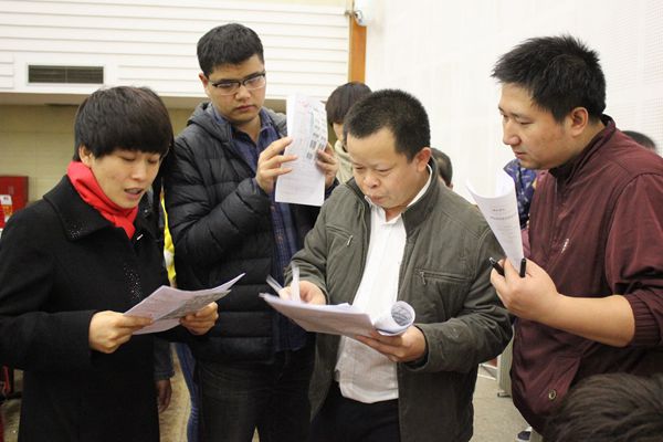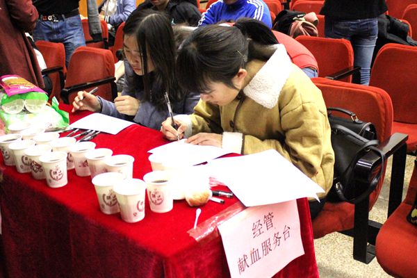 的献血志愿者们都在低头认真填写无偿献血登记表,13级辅导员乔多老师在服务台旁耐心的嘱咐同学们献血的注意事项,14级辅导员闻海洋老师也一直在与同学们聊天缓解同学们紧张的情绪。