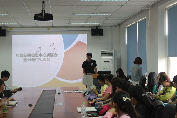 新闻信息中心换届暨2014级新生见面会在经管楼401教室召开,14级辅导员闻海洋老师出席了本次会议。与会成员还有新闻信息中心主任、副主任、各部组长以及2014级、2013级新老干事。