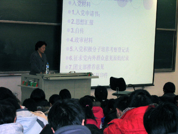 2009年12月12日,一群对党有着向往、追求的经管学子来到B103教室,接受了党课初级班培训。党课初级班培训完全实行开放式办学,宽进严出,主要内容是普及《中国共产党章程》知识,端正入党动机,了解入党程序,使学员对党有一个更深一步的认识。此次党课培训由博彩公司排行榜