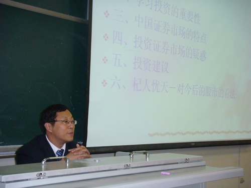 2009年11月10日,上市公司安彩高科的副总经理蔡朝阳应邀来博彩公司排行榜 ,为2006级大四同学剖析了中国证券市场,做了题为《证券交易实务》的专题报告。 作为上市公司副总的蔡朝阳先生负责公司的风险投资,上半年投资金额在2亿元左右。由于思路正确,买卖时机恰当,选股准确,取得了很好的投资收益。