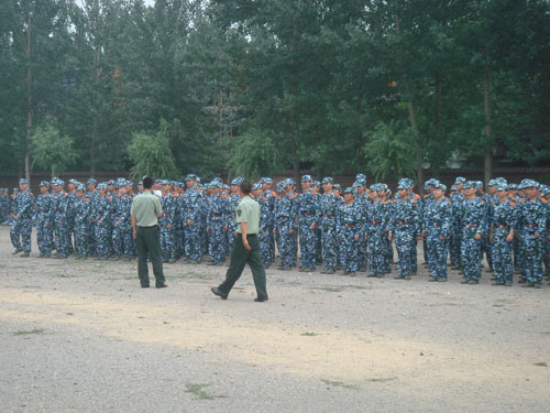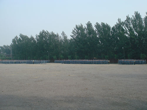 全体08级学生在操场集合,大家沐浴在阳光下,等待乘车前往怀柔军训基地。