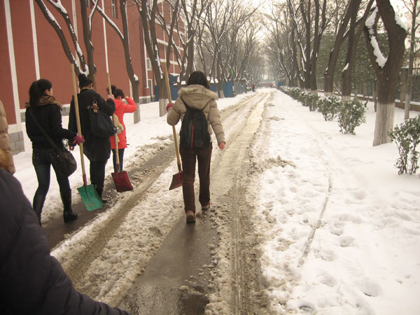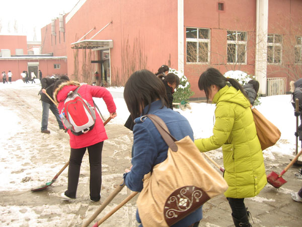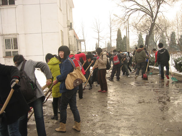 我院有200余人志愿参加本次了扫雪活动,主要是我院学生党员、入党积极分子和部分2008级学生,大家积极踊跃,不嫌脏,不怕冷,主要打扫了荷花池周围、体育馆后面,二食堂东侧以及礼堂后侧的主干道,给大家的出行提供了方便。