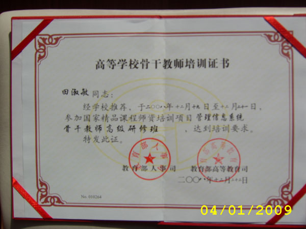 管理信息系统(MIS)是管理科学与工程、工商管理等类下设的本科专业的核心课程。经管系教师田淑敏于2008年12月19日至12月21日参加了教育部全国高校教师网络培训中心举办的国家精品课程MIS骨干教师高级研修班,先后聆听了刘业政教授主讲的MIS精品课程建设与教学改革、梁昌勇教授的MIS规划与开发和李兴国教授的MIS应用与管理等示范授课、以及李一军教授主讲的中国大陆、台湾和美国MIS专业本科教学计划的比较。期间还积极参与MIS的教学改革、难点等讨论,并及时提交培训布置作业,获得了“MIS骨干教师高级研修师资培训”证书。