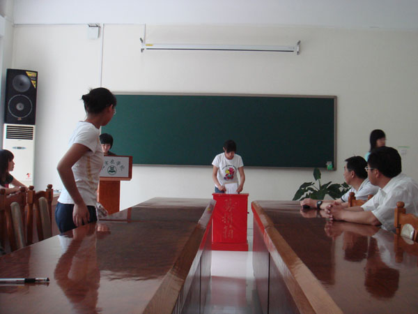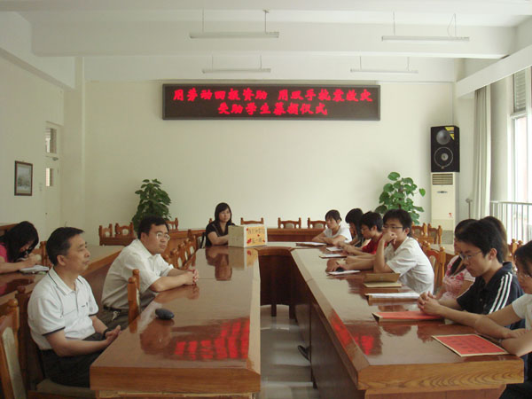 2008年5月27日下午,由经济管理系与学生处勤工助学中心联合发起的“用劳动回报资助,用双手抗震救灾”受助学生募捐仪式在教B-209举行。学生处副处长张国柱,团委书记杨宝东,校医院张院长出席了此次捐赠仪式。