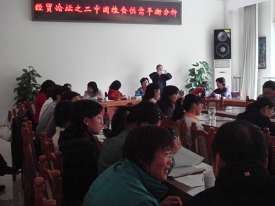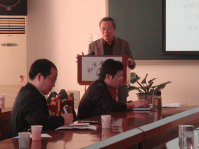 2007年10月17日下午两点,经贸系邀请了著名农业经济学家、中国农科院农业经济与发展研究所前所长朱希刚研究员进行了题为“中国粮食供需平衡分析”的学术报告。朱希刚研究员首先对中国粮食总需求进行了估计,我国粮食总需求因为人口的增加、国民收入的增长和城市化进程的推进三方面原因将持续增长,到2010年、2020年粮食总需求分别达到53746、58220万吨。其次,朱希刚研究员分析了中国粮食生产的波动,从长期看,我国粮食将会出现供需缺口,但缺口不会很大。最后朱希刚研究员提出了中国粮食供需平衡对策建议,即,通过政策引导实现自我平衡;做好两手准备;增加粮食净进口量的份额。