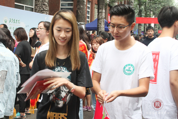 志愿者的服装,热情洋溢的为学生和家长讲解着报道的程序和注意事项,并带领他们前往宿舍办理手续。