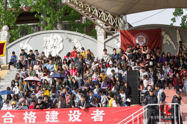 运动员们在赛场上挥洒汗水的时候,观众看台、主席台以及场外服务台的同学们也在勤勤恳恳地为运动会奉献自己的力量。
