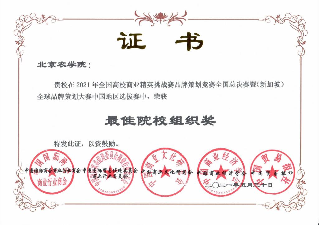 获得一等奖1项,二等奖2项和三等奖1项的佳绩。其中的《老栗树品牌策划书》斩获“2021年全国总决赛一等奖,并入围(新加坡)全球品牌策划大赛”,成为18个参加新加坡全球品牌策划大赛的中国团队之一,也是北京参赛高校唯一一个进入全球赛的团队,并将代表中国赛区参加全球总决赛。