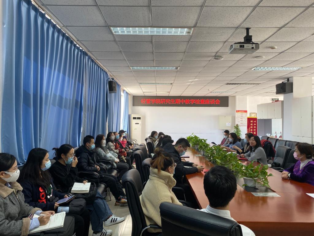 研究生期中教学检查座谈会在经管楼401进行。会议由副院长张晓凤老师主持,研究生督导隋文香老师、农林经济管理专业赵海燕老师、工商管理专业桂琳老师、国际商务专业刘亚钊老师、研究生秘书和辅导员老师、研究生各班班长、团支书、学生代表参加了座谈会。