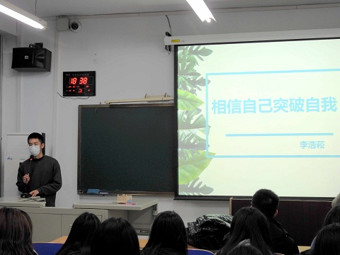 李浩菘同学演讲的主题是《相信自己,突破自我》,讲述了他担任校学生会主席团成员的经历,从选举时试一试的态度到对自己怀疑与倍感压力,再到最后拨开乌云,重见阳光。他说:“要相信自己,相信自己可以,要能够突破自己,觉得自己可以,这世界上没有什么难事,创造属于你们自己的世界。最主要的是,要感受到这个世界的美好,而感受世界美好的前提就是相信自己,突破自我。”