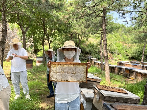 7月25日,在欢乐蜂场园区负责人赵丽梅的带领下,同学们到蜂农家里进行取蜜割蜜、参加互动式“蜂文化”休闲体验、帮助园区进行“直播带货”后的产品打包,真正体会到农业的多种功能如何拓展,小小的蜜蜂是怎样做成一个大产业。