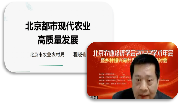 北京市农业农村局总农艺师程晓仙在线上以“北京都市现代农业的高质量发展”为题作主旨发言。程晓仙总农艺师主要从北京都市现代农业概况、农业高质量发展的基本思路、今后北京农业发展的路径思考三个方面描绘了北京农业发展美好画卷,既有北京农业发展的成就,更有今后首都农业高质量发展的宏伟蓝图,报告内容丰富,生动鲜活,为与会的专家学者开展都市农业研究提供了新思想,新见解。
