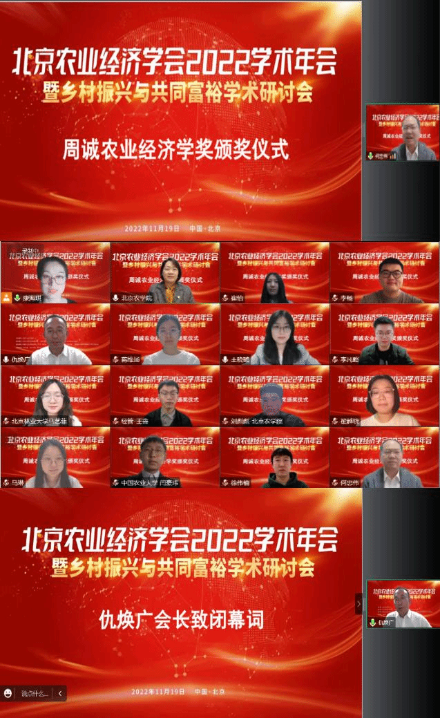 研究生处处长、北京农业经济学会副会长何忠伟主持。何忠伟教授宣布了12名“周诚农业经济学奖”获得者,在线上举行颁奖仪式。中国人民大学农业与农村发展博彩公司排行榜院长、北京农业经济学会第八届理事会会长仇焕广教授作大会闭幕词。