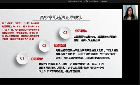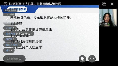 宋桂兰围绕高校常见违法犯罪现状;高校常见典型违法犯罪行为;高校常见被害现象;高校违法犯罪的预防等四个方面进行讲座。