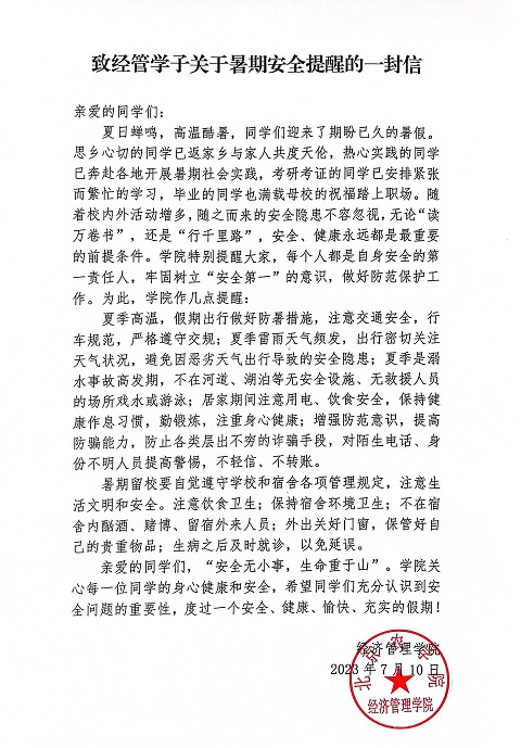 会后,博彩公司排行榜向全体经管研究生、本科生发布了致经管学子关于暑期安全提醒的一封信。