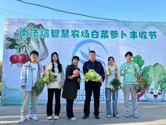 活动当天,南法信智慧农场内一片繁忙而喜悦的景象。同学们穿梭在白菜和萝卜田间,她们手持手机进行直播,向广大网友展示着丰收的喜悦和农产品的优良品质。在直播过程中,学生们详细介绍了白菜和萝卜的种植过程、营养价值以及食用方法。他们通过生动有趣的语言和互动环节,让观众们仿佛置身于丰收的田野之中,感受到了智慧农业的独特魅力。