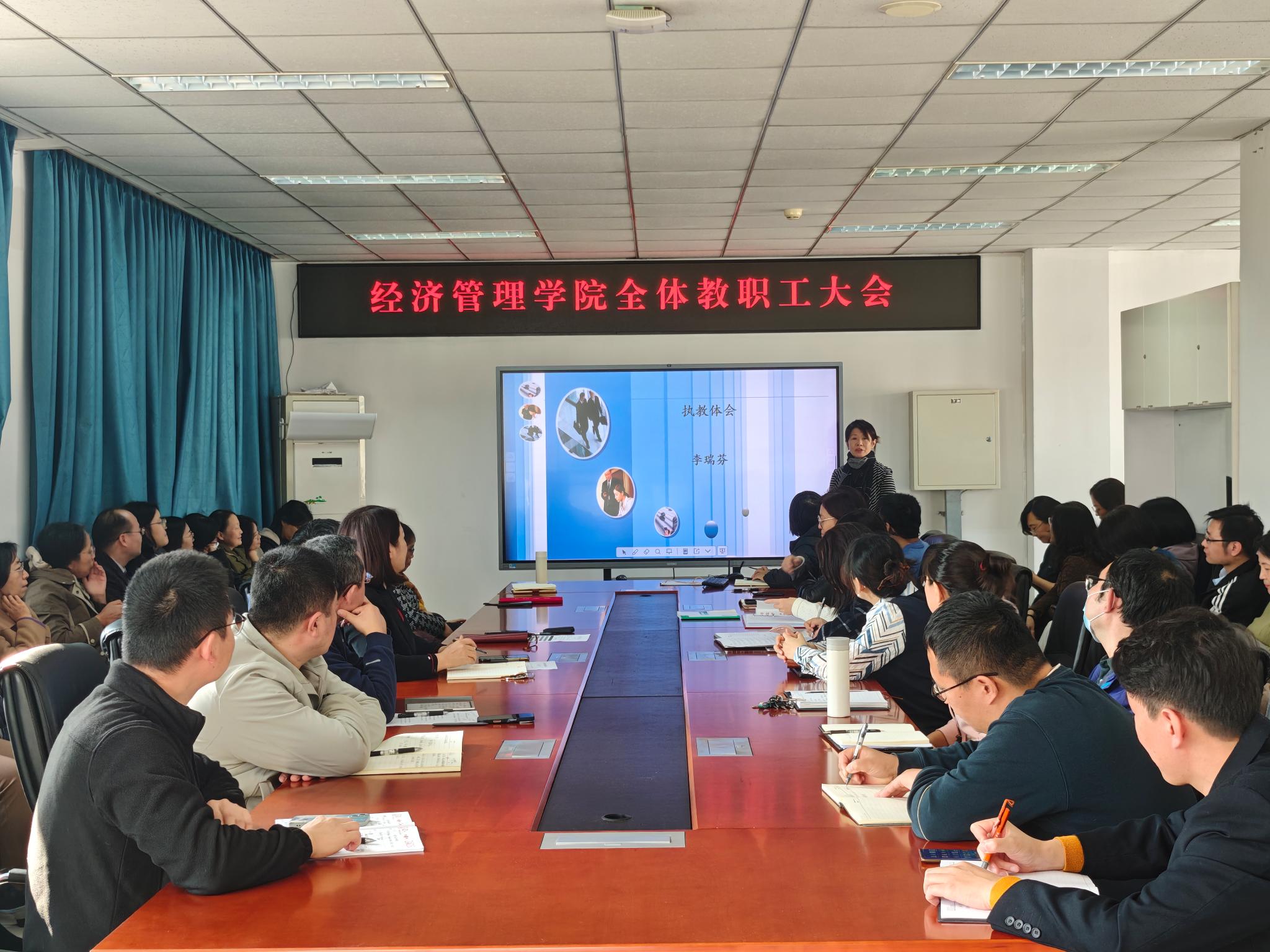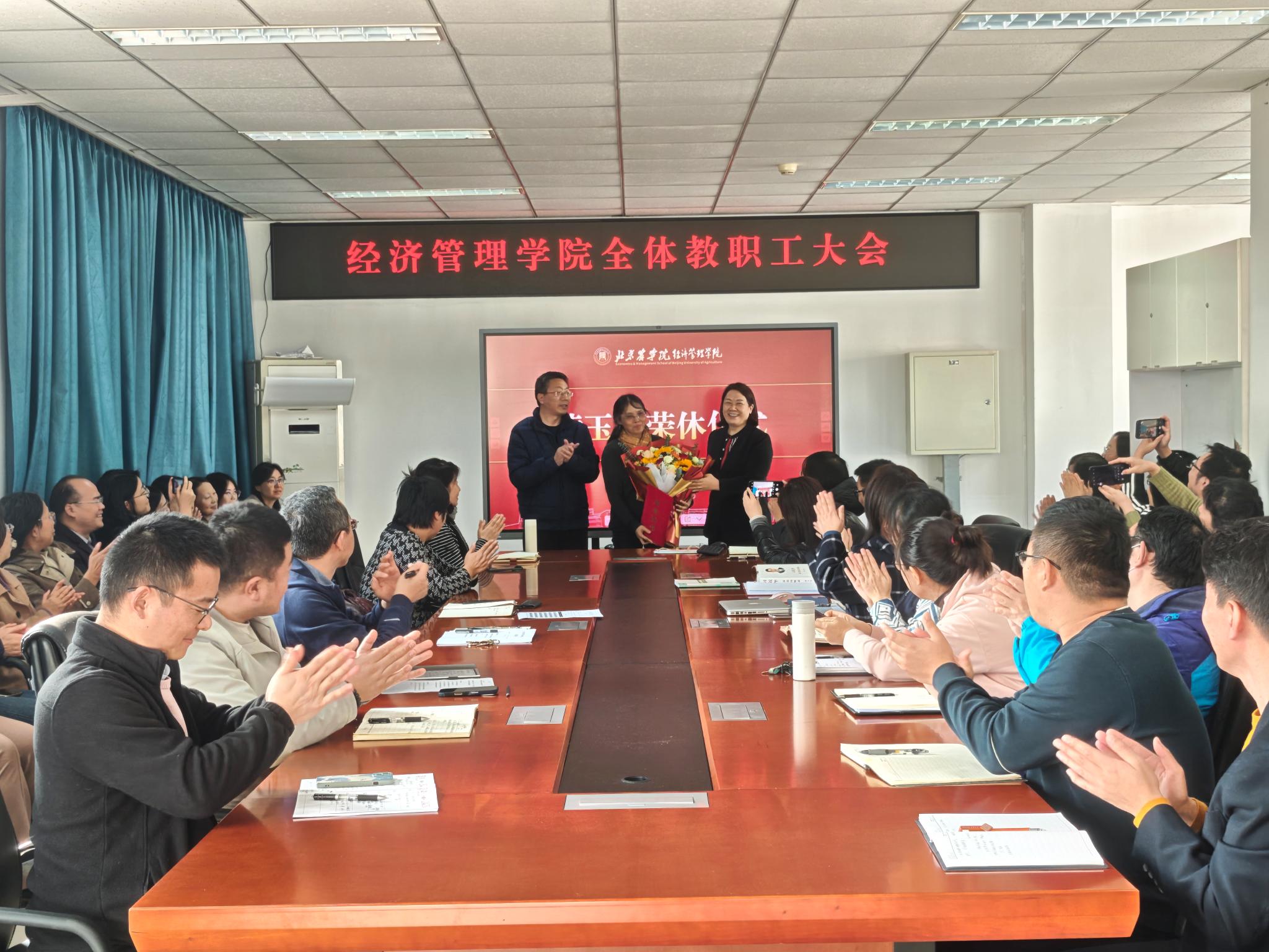 在经管楼401会议室举行全体教职工大会,隆重举行黄玉梅老师荣休仪式,特邀李瑞芬老师分享育人故事,并部署近期重点工作。会议由博彩公司排行榜党委书记刘芳主持,全体教职工齐聚一堂,共同见证荣耀时刻,汲取育人智慧。