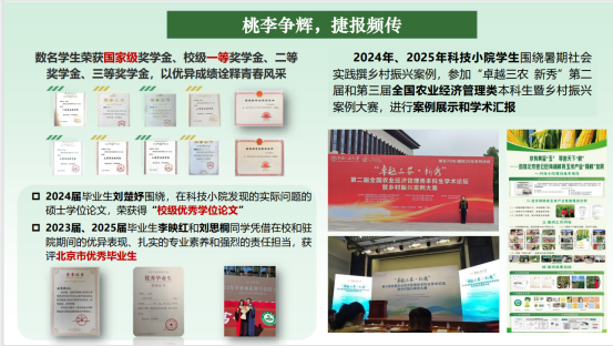 优秀硕士学位论文、2名研究生获北京市“优秀毕业生”等荣誉称号,在服务乡村振兴中解民生、治学问,实现了学术成果和实践能力的双丰收。指导研究生过程中,她既以严谨治学态度要求学生深耕学术,又以细致入微的关爱温暖学生成长之路。学生眼中的她,老师就像一位大家长一样,师门的所有兄弟姐妹像一个个被保护的孩子,在学习科研和生活态度上受益颇多。在她的影响下,所带学生毕业后,许多学生积极响应国家号召,投身“三支一扶”计划,扎根基层一线,为乡村振兴和生态文明建设贡献青春力量;亦有学生走上中华合作时报、农民日报要闻编辑记者岗,深耕“三农”沃土;还有学生选择回到校园,成为北京市园林学校的教师,接过教鞭,续写农教华章,生动诠释了“明师之恩,诚为过于天地”的深厚师生情谊。