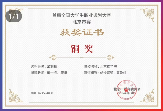 2023级农林经济管理专业的梁羽菲。在职业生涯规划大赛中,我连续获得了两届校赛一等奖,还获得了首届全国大学生职业规划大赛北京市铜奖的成绩。回首备赛历程,感慨万千,现将心得与大家分享。