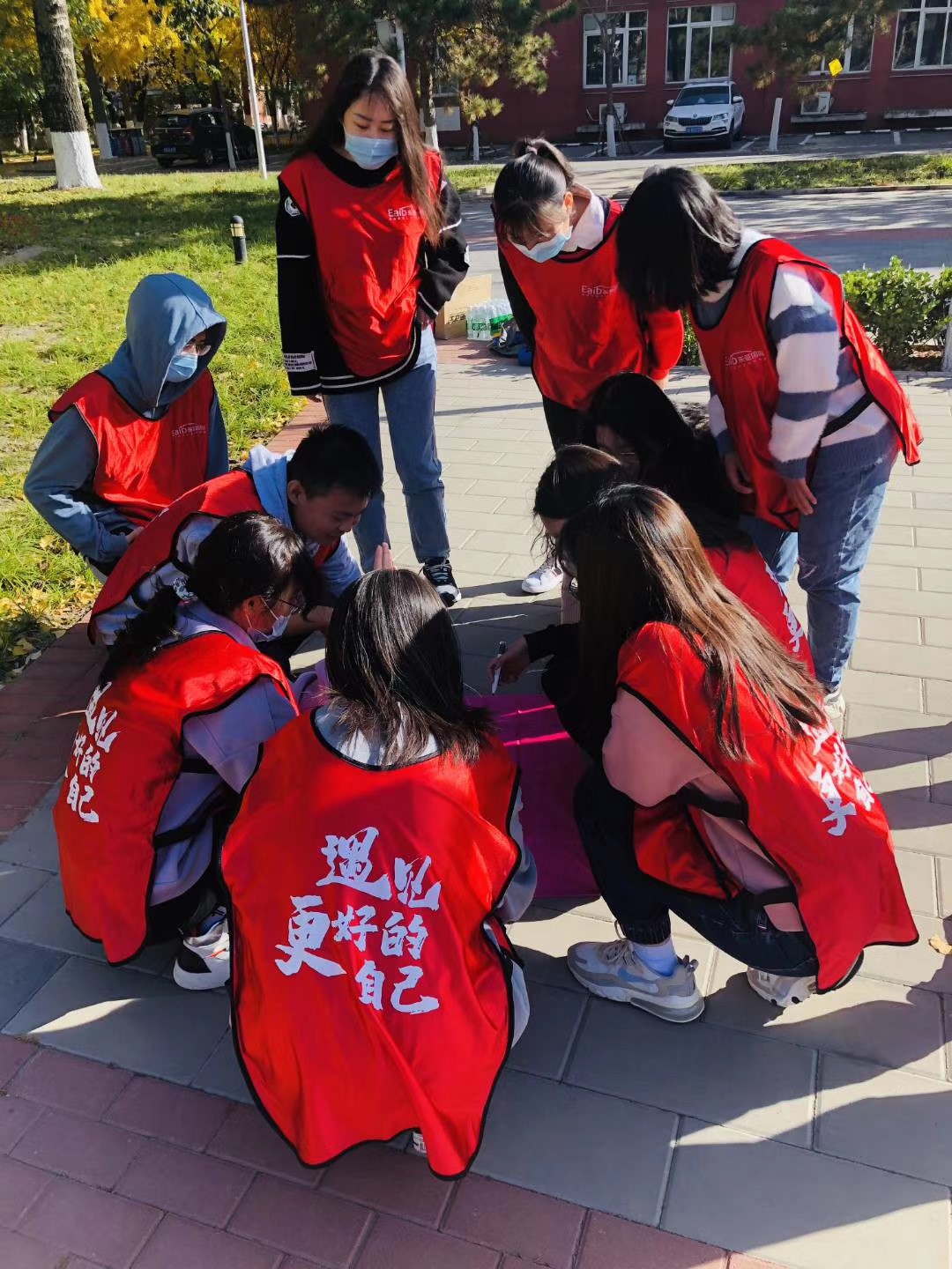 找到了方法后,项目变得简单起来。有队员建议大家应该分成两拨各拿一个球站在地毯的两侧分别踩一半的数字,并且在对面上场的时候做好球的传递交接。另一些队员则在积极地安排上场顺序,让每个队员都参与到游戏中来。在练习的过程中大家配合地很好,每个上场的同学都只需要记住自己负责的数字的位置,在集体的努力下逐步攻克了所有的难点。