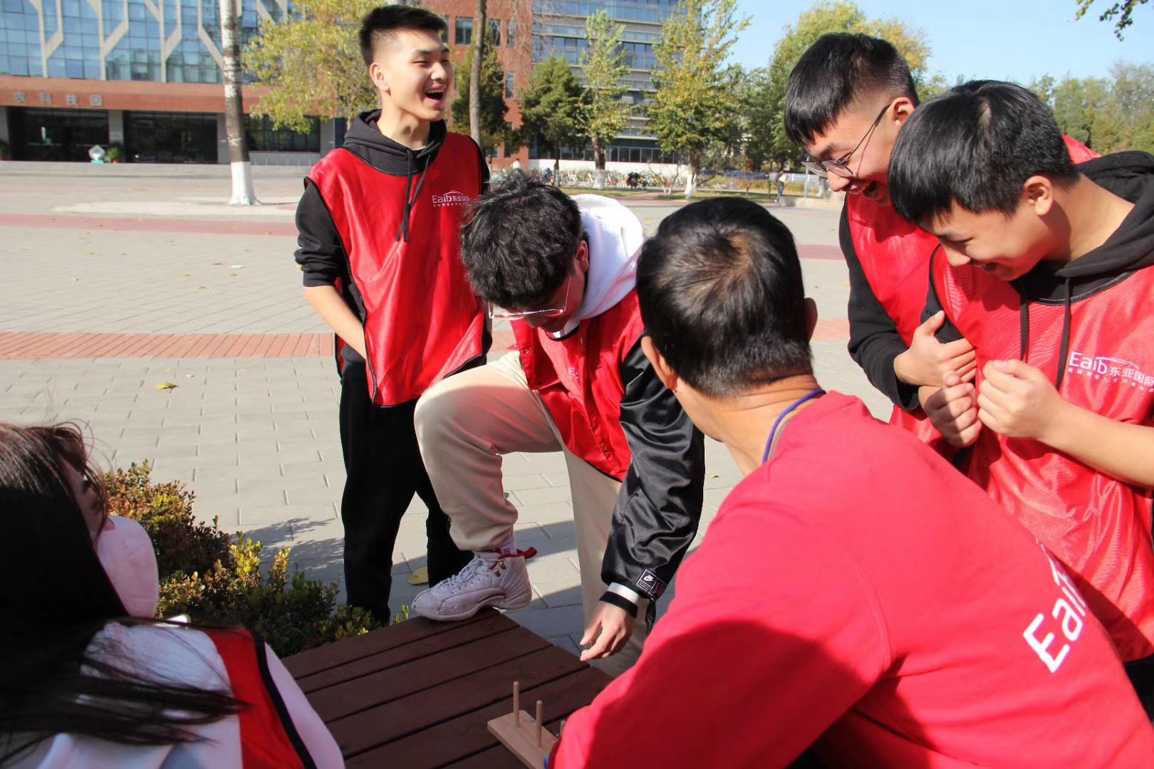带队老师将同学们分为了两队,并分别选出了队长和助理。在两队击掌过后,挑战正式开始。等待着两个队的是三项趋于困难的挑战和严苛的奖惩措施。第一项挑战叫汉诺塔,所用的道具汉诺塔是由一个底座,三根柱子和六个由小到大的彩色圆盘组成的。虽然是看似小巧的益智玩具,但它的玩法可真不简单。起初,所有的圆盘都按顺序垒放在第一根柱子上,需要在一次只能动一个圆盘的情况下将所有圆盘经过第二根柱子移动到第三根柱子上,且在移动过程中大的圆盘不能压小的。复杂的规则让同学们陷入了沉思,好在智商在线的队员们经过推算找到了解决问题的方法。在比赛时同学们排好队依次上前移动圆盘,虽然并不是所有同学都能熟练掌握圆盘的移动方法,但只要记住自己所需要移动的圆盘和位置就足以让团队完成任务。同学们就像运转精确的齿轮般高效率地完成了挑战。