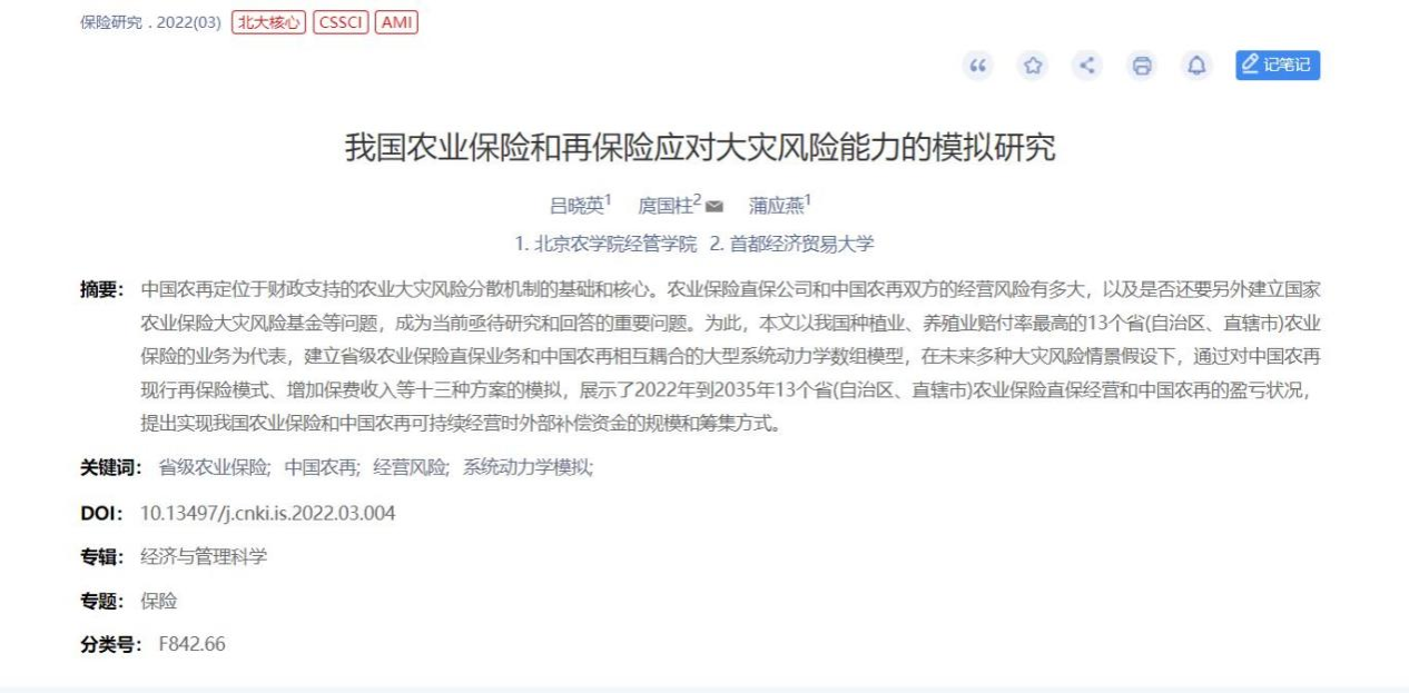 吕晓英教授团队在《保险研究》杂志(CSSCI/北大核心收录,2022年影响因子4.208)发表题为《我国农业保险和再保险应对大灾风险能力的模拟研究》的研究论文。该论文作为中国农业保险发展与应用领域的重要研究成果被中国人民大学复印报刊资料《农业经济研究》2022年第9期全文转载。