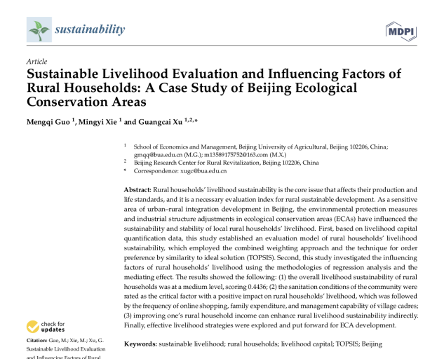 徐广才教授团队在国际期刊Sustainability杂志(SCI/SSCI收录,2023年影响因子3.9)发表题为《Sustainable Livelihood Evaluation and Influencing Factors of Rural Households: A Case Study of Beijing Ecological Conservation Areas》的研究论文。