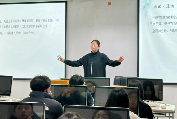 刘一阳结合两年工作经历分享了报考“三支一扶”计划之后服务基层的心路历程和备考经验;荆雨涵从事业单位考试的选岗、备考和应试等角度出发,细致讲解了整个流程和注意事项。两位校友还针对现场同学提到的报名条件、岗位选择,以及工作实际情况等问题做了详细的解答。通过本次活动,更好地帮助学生认识相关岗位职责和工作内容,做好提早规划和准备。