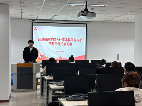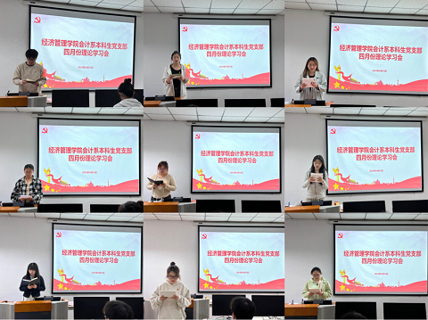会计系本科生党支部召开四月份理论学习会,重点学习《中国共产党纪律处分条例》以及“学习纪律强化月”的相关要求,引领带动支部党员、积极分子学党纪、律自身、见行动、促发展,会议由支部书记吴曈主持。