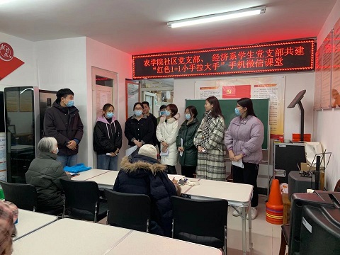 在进行简单自我介绍后,同学们很快便与社区报名学习的老年人熟悉起来,在交流了解的过程中有序开展智能手机的微信教学。老年人和学生的积极性都很高,一对一的教学模式使得教学效果更加显著。