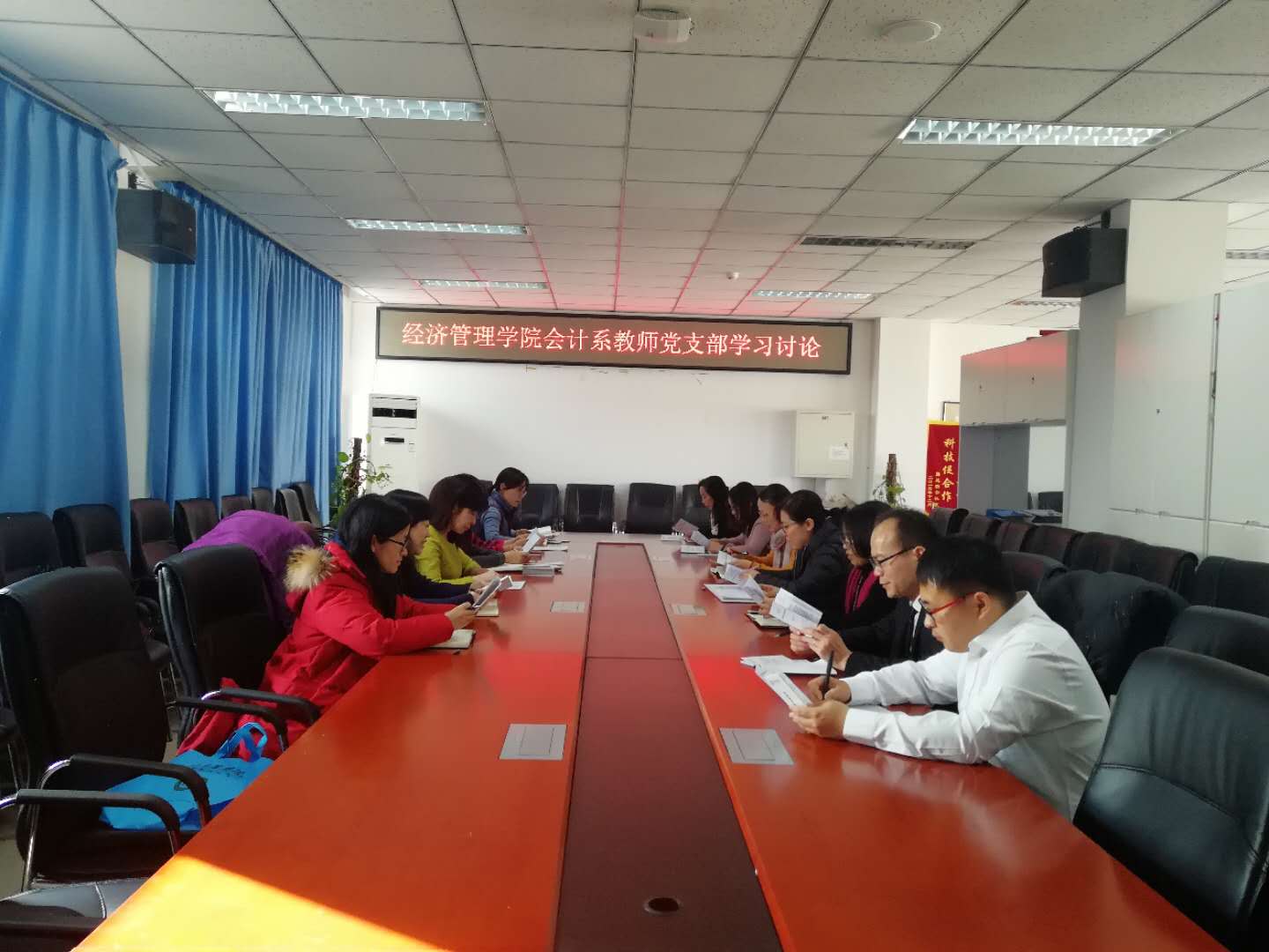 2018年12月14日,会计系教师党支部组织会计系全体老师和院办全体老师共同学习本科审核评估文件资料。